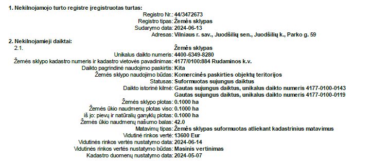 10 ARŲ ŽEMĖS SKLYPAS VILNIAUS R. SAV., JUODŠILIŲ SEN., JUODŠILIŲ K., PARKO G. 59. Daikto pagrindinė naudojimo paskirtis – Kita, žemės sklypo naudojimo būdas – Komercinės paskirties objektų teritorijos. Žemės sklypas suformuotas atliekant kadastrinius matavimus. Šalia sklypo yra elektra. Kaimynystei naujai pastatyti gyvenamieji namai.